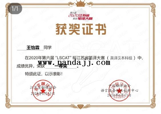 今年大三,连续两年获校一奖学金和三好学生。2021年江苏省LSCAT笔译大赛二等奖。全国大学生翻译大赛三等奖。高等数学建模团二等奖。